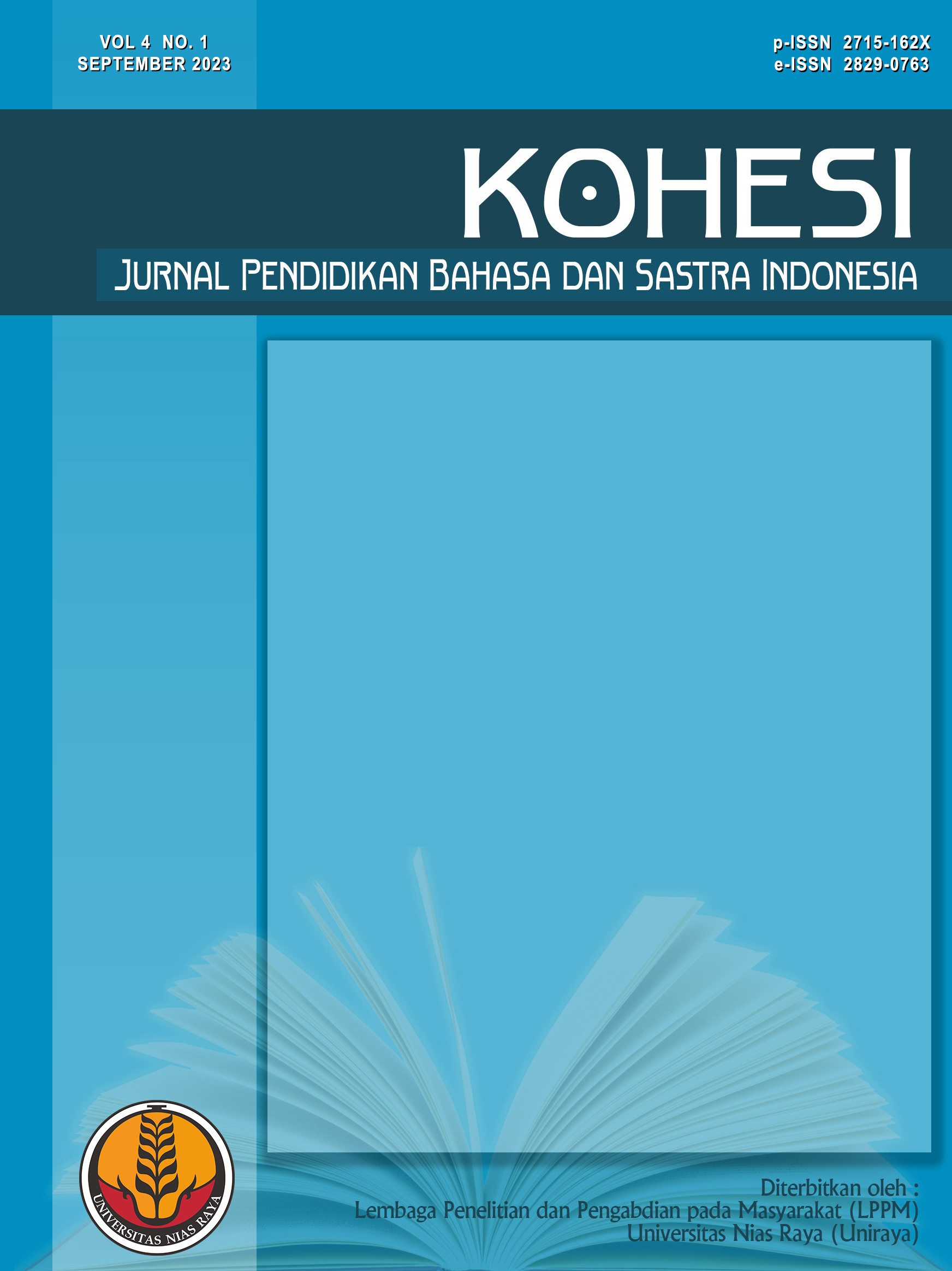 KOHESI : Jurnal Pendidikan Bahasa dan Sastra Indonesia adalah jurnal ilmiah yang bertujuan menyediakan wadah untuk publikasi hasil penelitian atau riset di bidang Pendidikan Bahasa dan Sastra Indonesia. Jurnal ini diterbitkan oleh Lembaga Penelitian dan Pengabdian kepada Masyarakat Universitas Nias Raya dengan frekuensi terbit dua kali setahun, yaitu pada bulan Maret dan September.